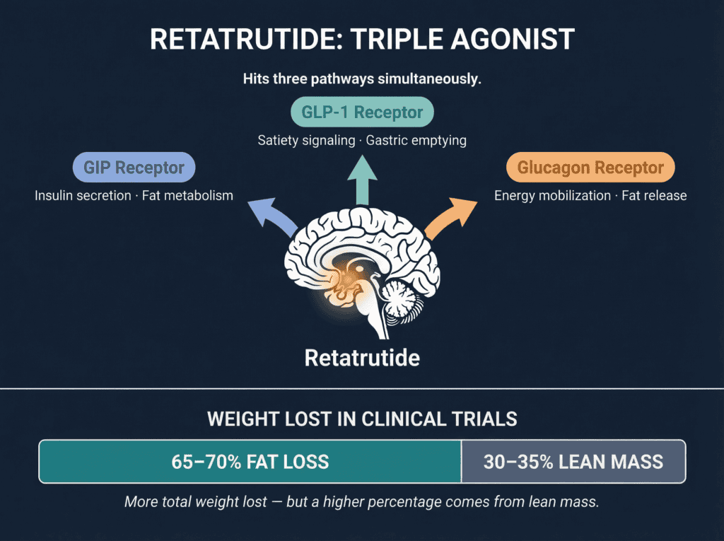 - Retatrutide’s fat-to-lean ratio runs roughly 65-70% fat, 30-35% lean mass.