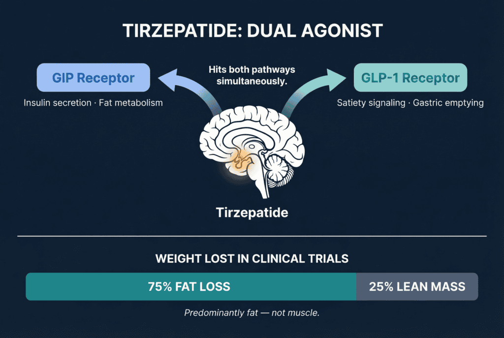Tirzepatide is a dual GIP + GLP-1 agonist. It hits two receptor pathways simultaneously.